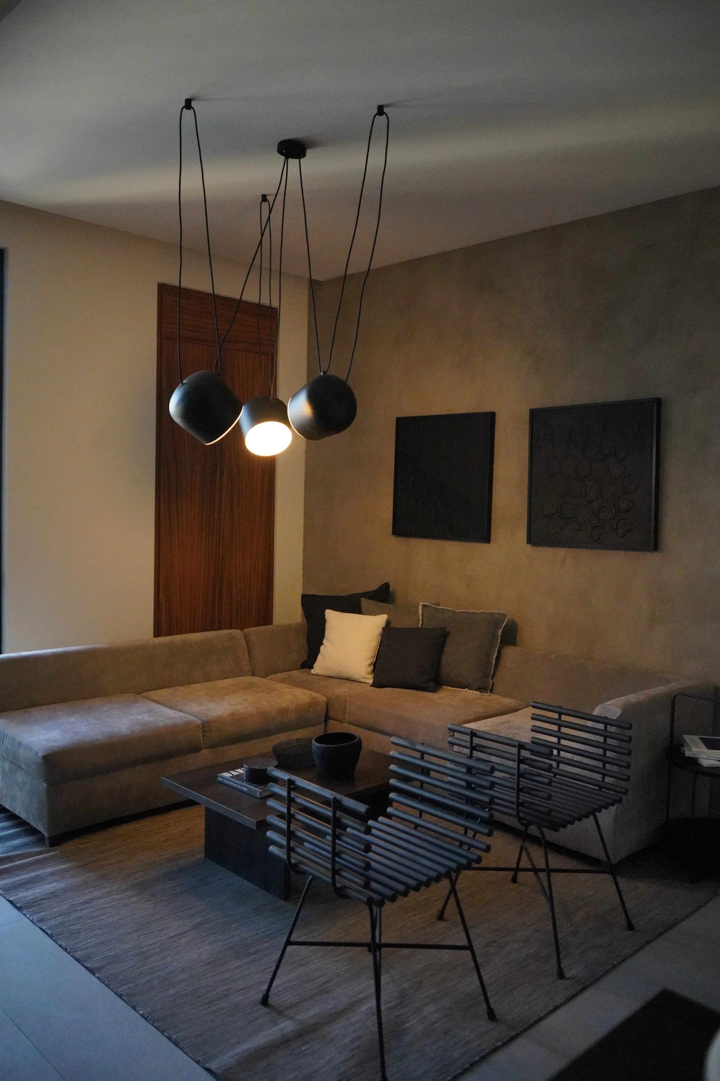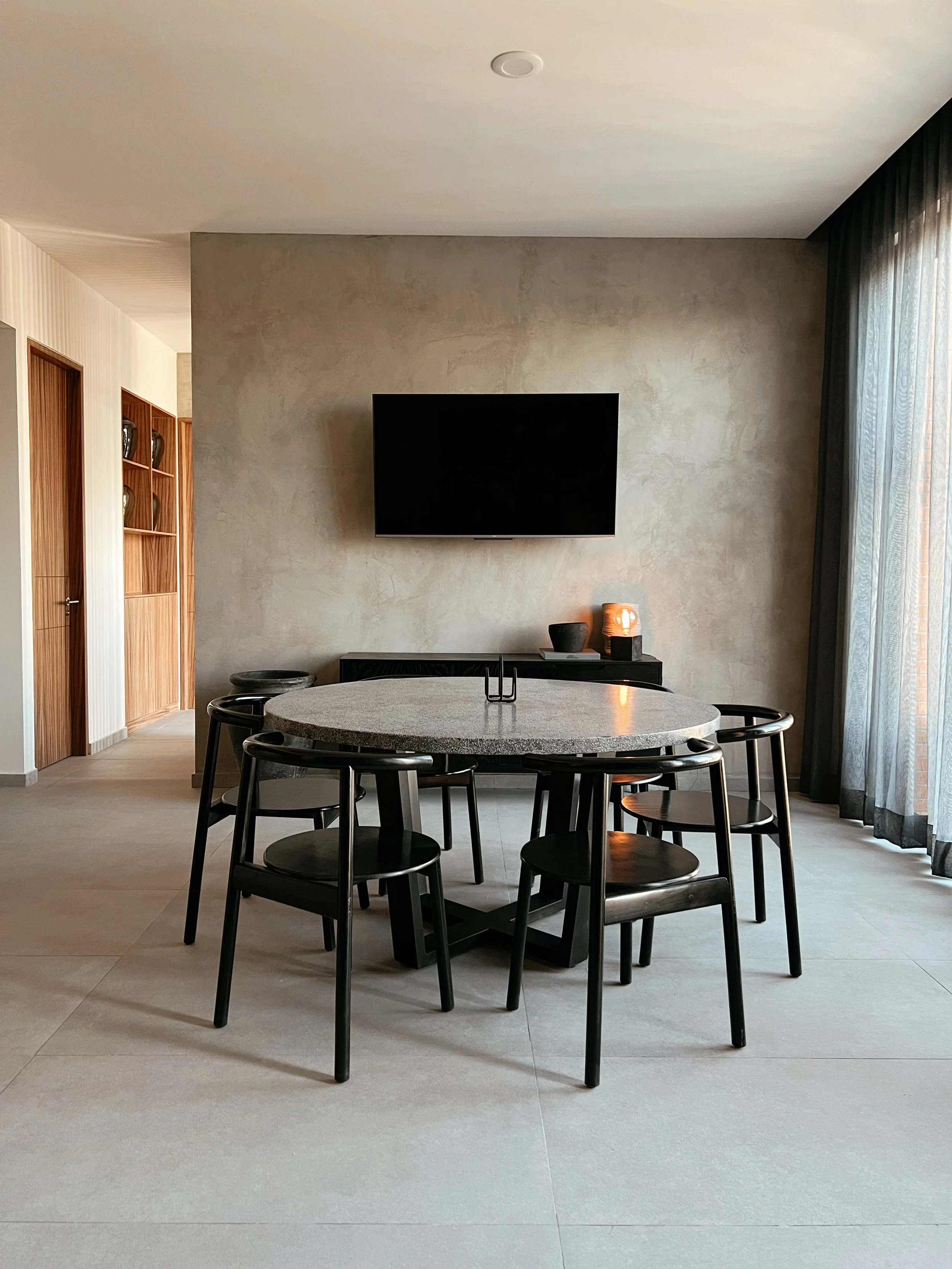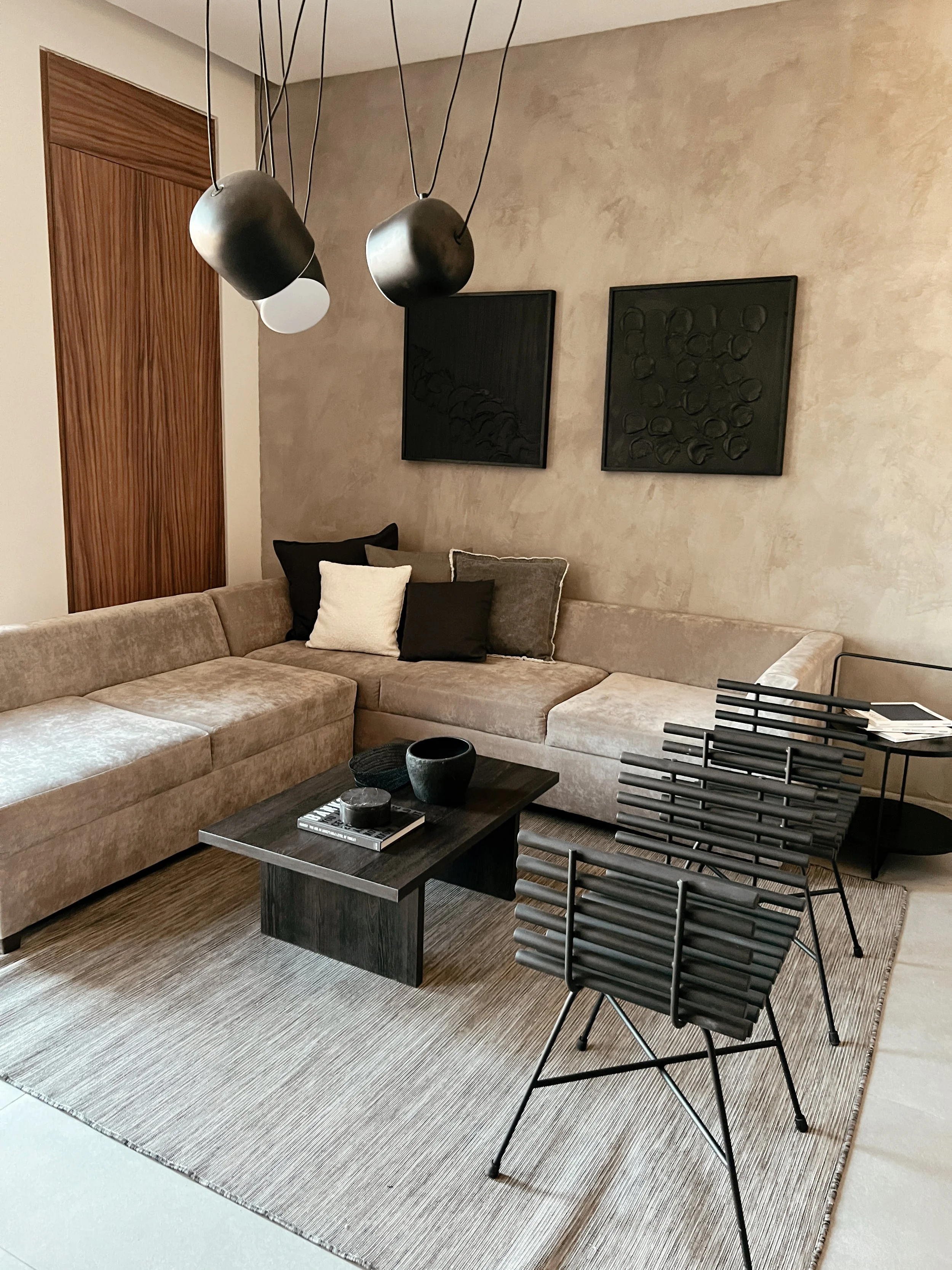 En una paleta de colores neutra y obscura buscamos crear balance entre materiales naturales, texturas orgánicas y maderas en diferentes tonos.
