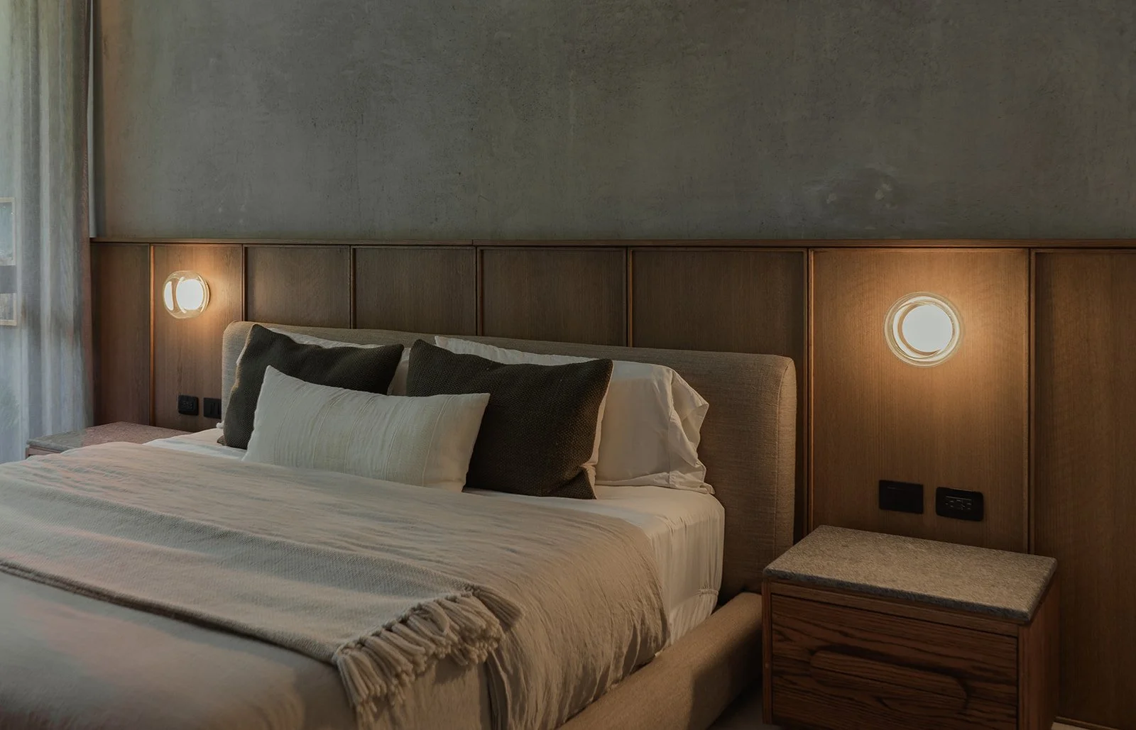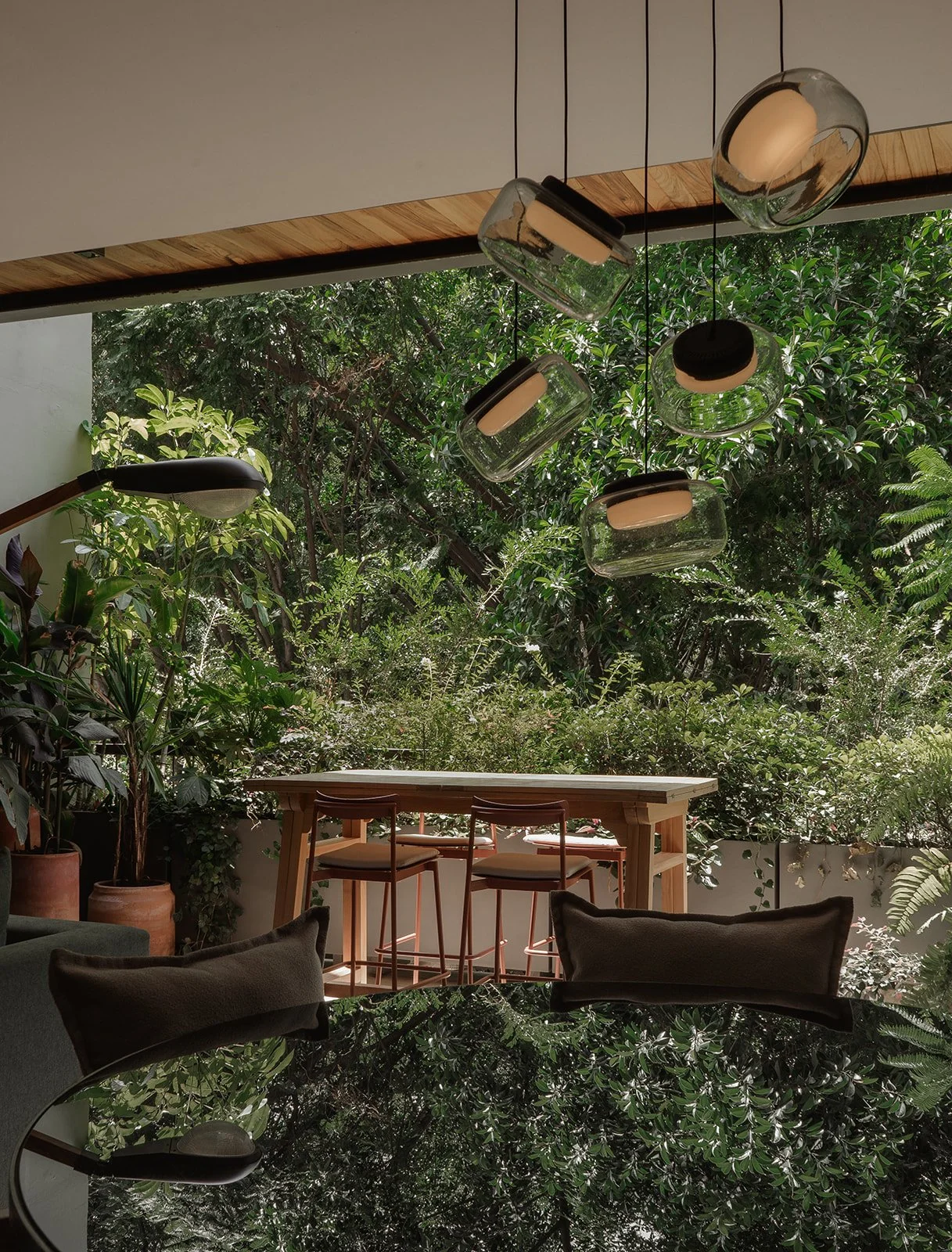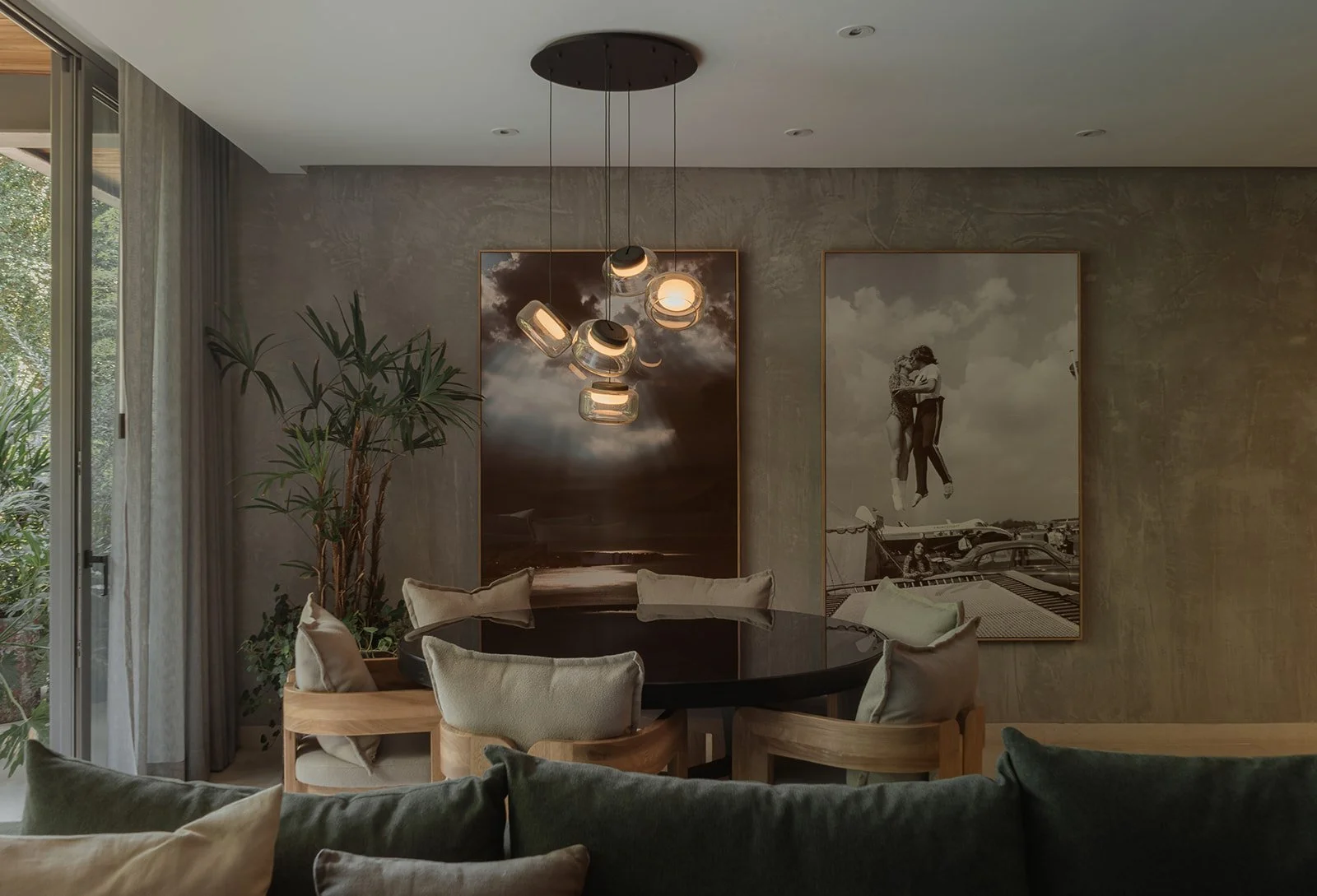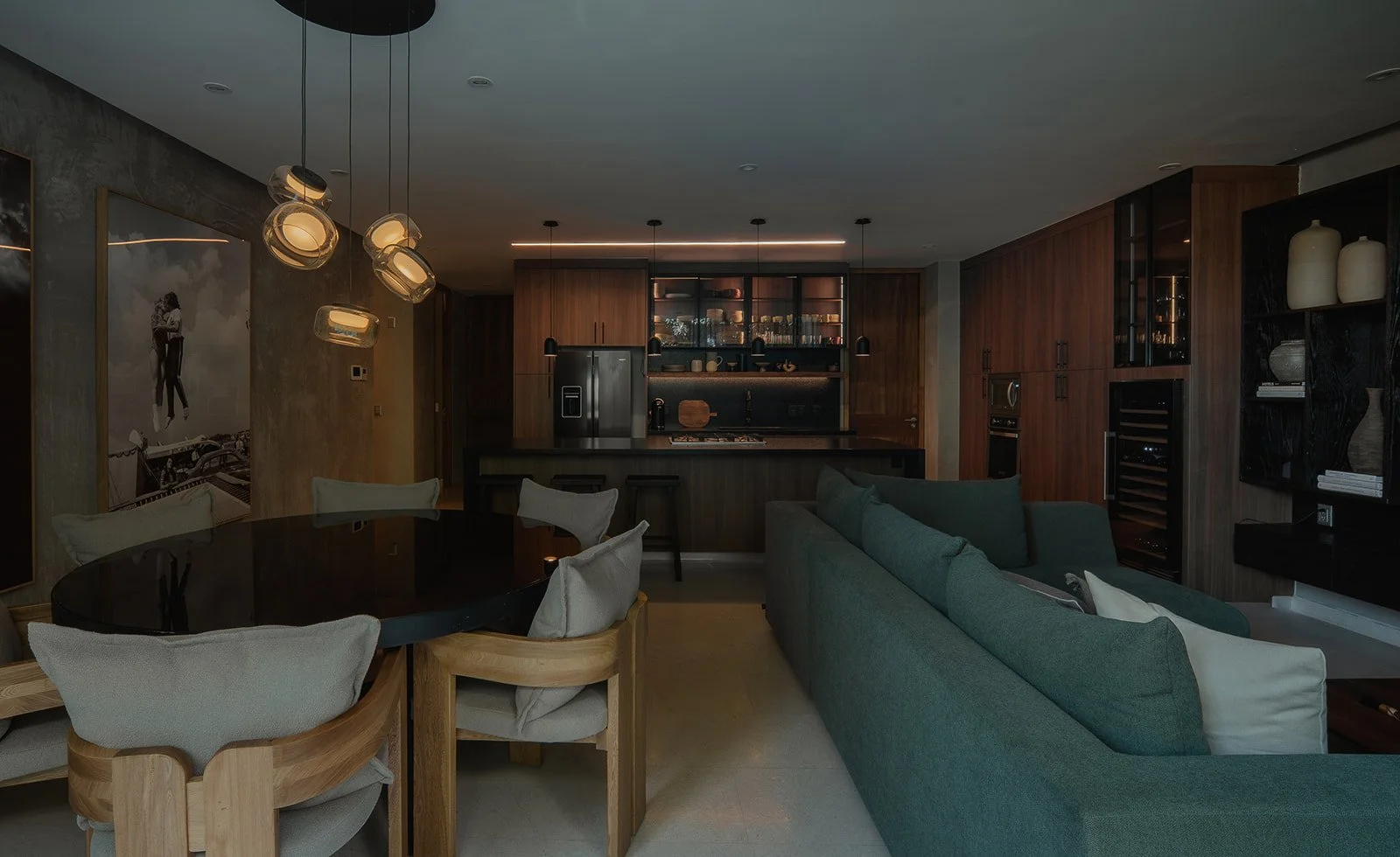 La madera, la luz tenue y las piezas personalizadas generan una atmósfera íntima, mientras que el mobiliario y las texturas hablan de un diseño atemporal, sofisticado y lleno de carácter.