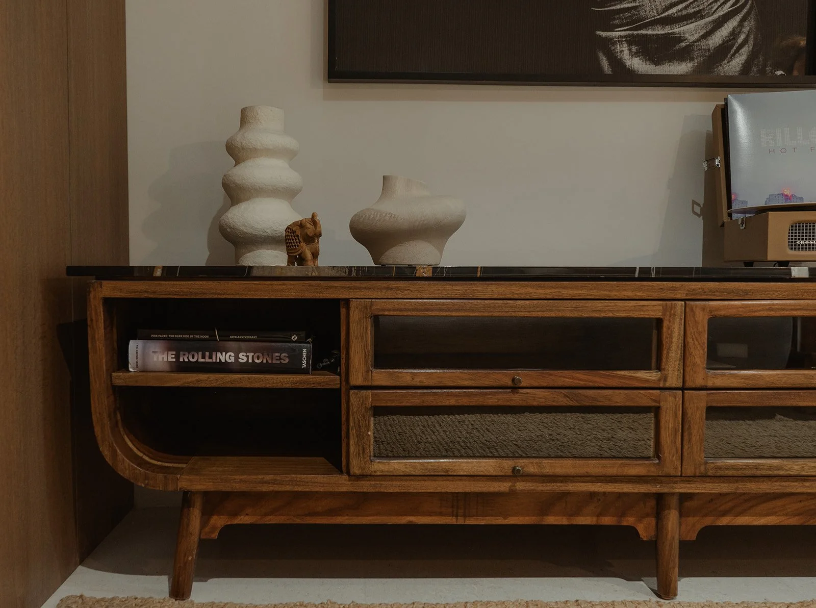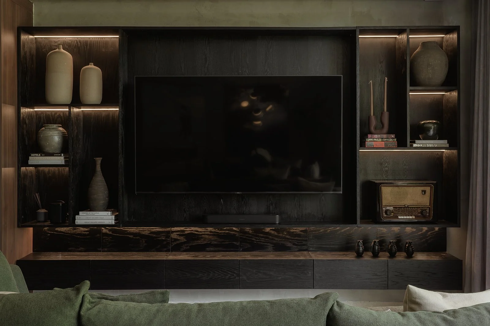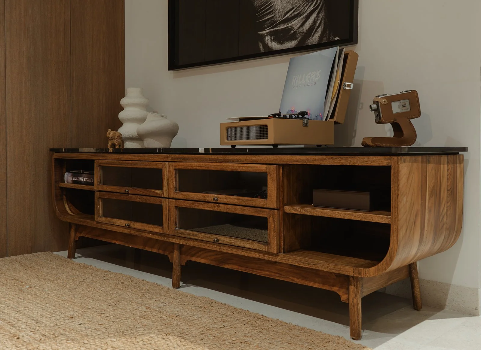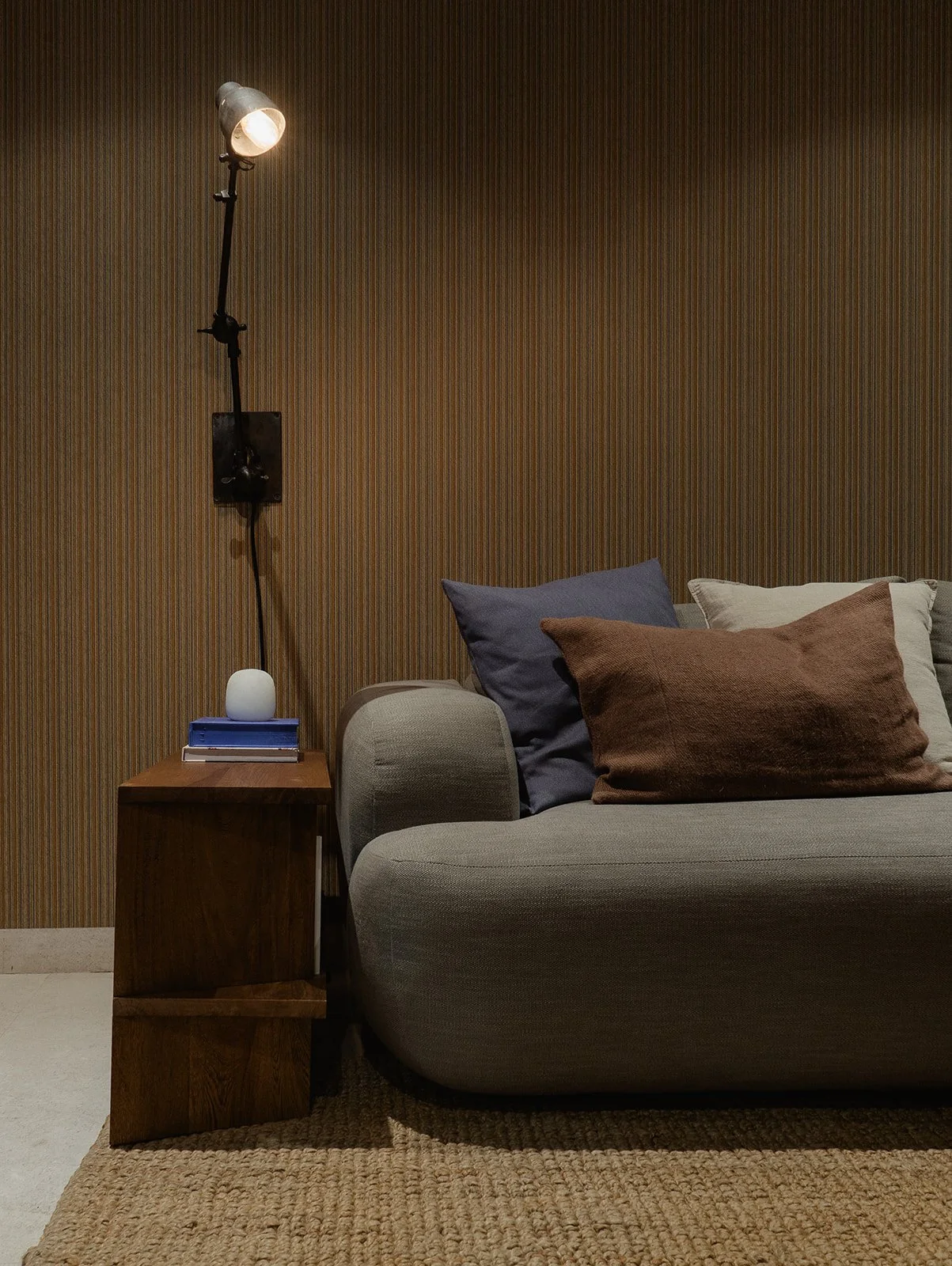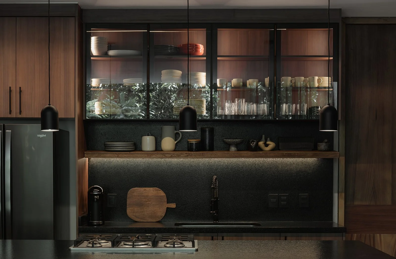 La madera, la luz tenue y las piezas personalizadas generan una atmósfera íntima, mientras que el mobiliario y las texturas hablan de un diseño atemporal, sofisticado y lleno de carácter.