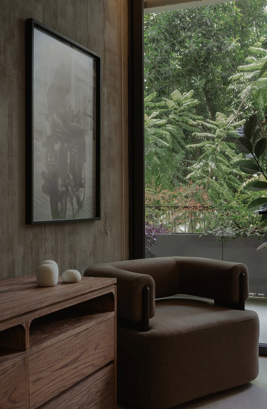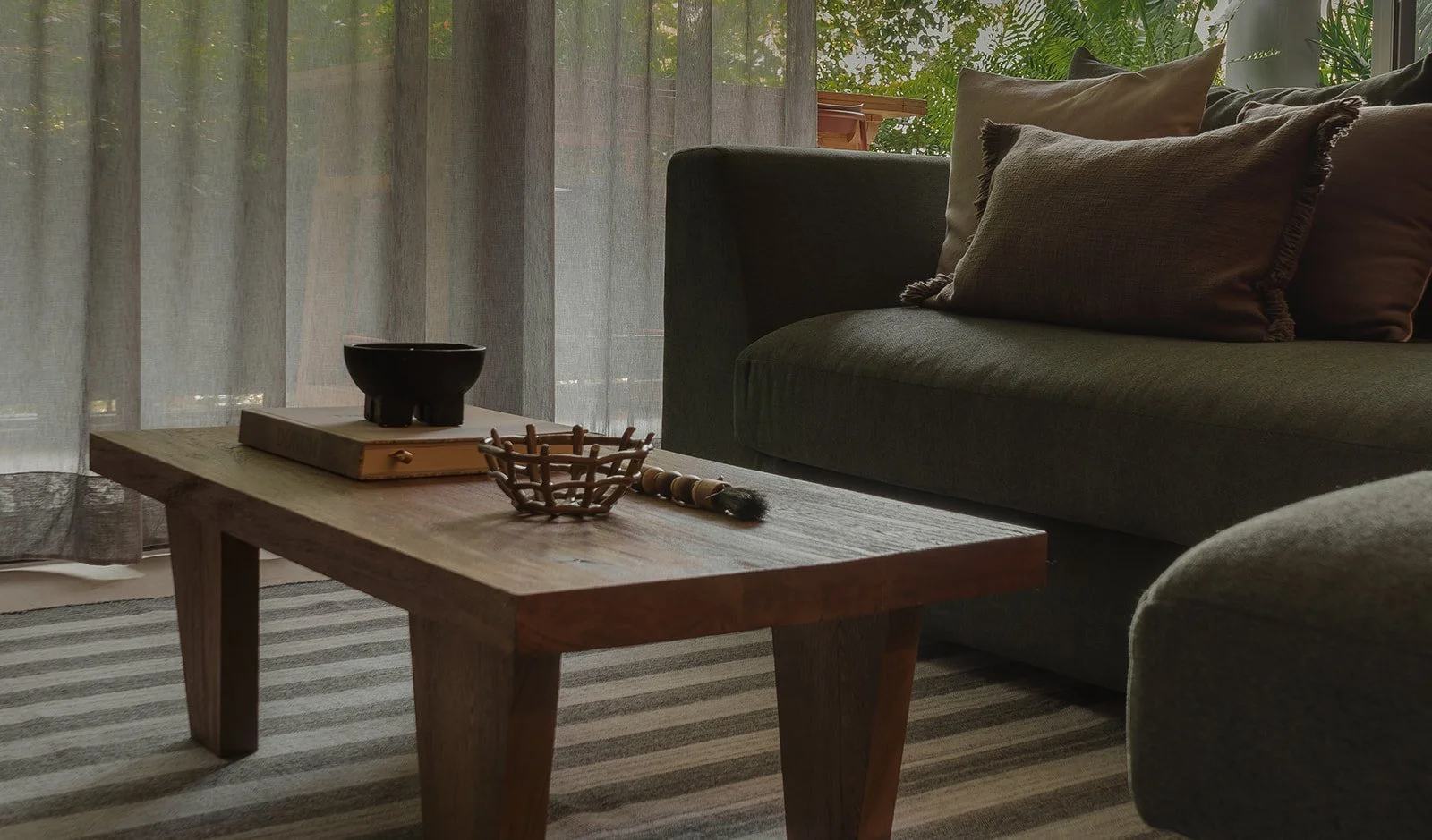 Diseñamos este espacio en Mar de Ross, un proyecto que fusiona la calidez de la carpintería fina con la serenidad de los materiales naturales. Cada detalle fue concebido para integrarse con la vegetación exterior y potenciar la conexión interior–exterior.